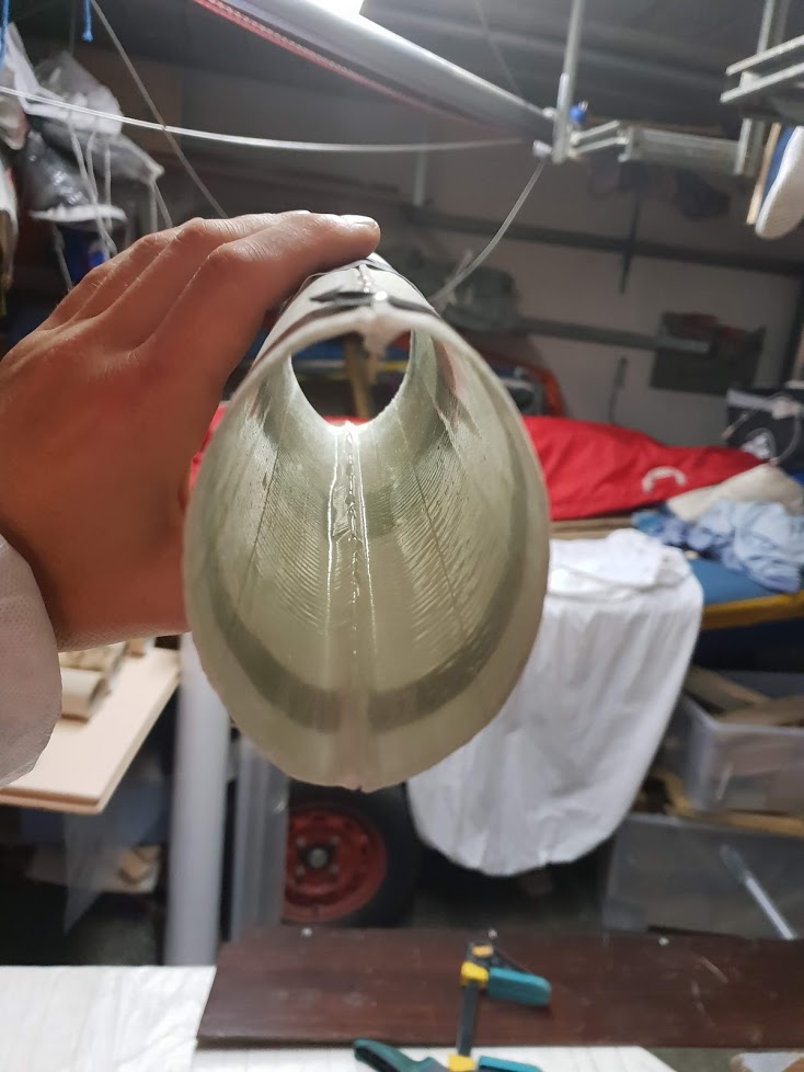 Ajout de renforts intérieurs sur chaque demi-bôme en vue des découpes pour les poulies de tanguon, de bordure de bome et le hale-bas : Réalisation d'un pièce moulée qui sera collée et qui fera office de vit mulet femelle. Le doigt en inox restera sur le mât. Vue du renfort Hale bas, un UD 300 à 0°, un à 30° en dessous pour reprendre l'effort du hale bas en traction et un sergé pour fixer le tout.