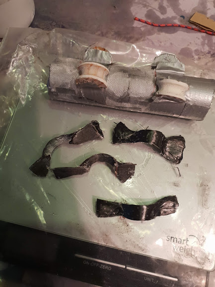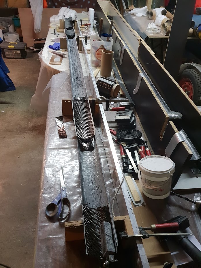 ... sur des gabarits... reste collage donc, puis du sergés carbone drappé autour pour le maintien de l'ensemble et pour l'aspect final puis réalisation de pièces, hale-bas etc...