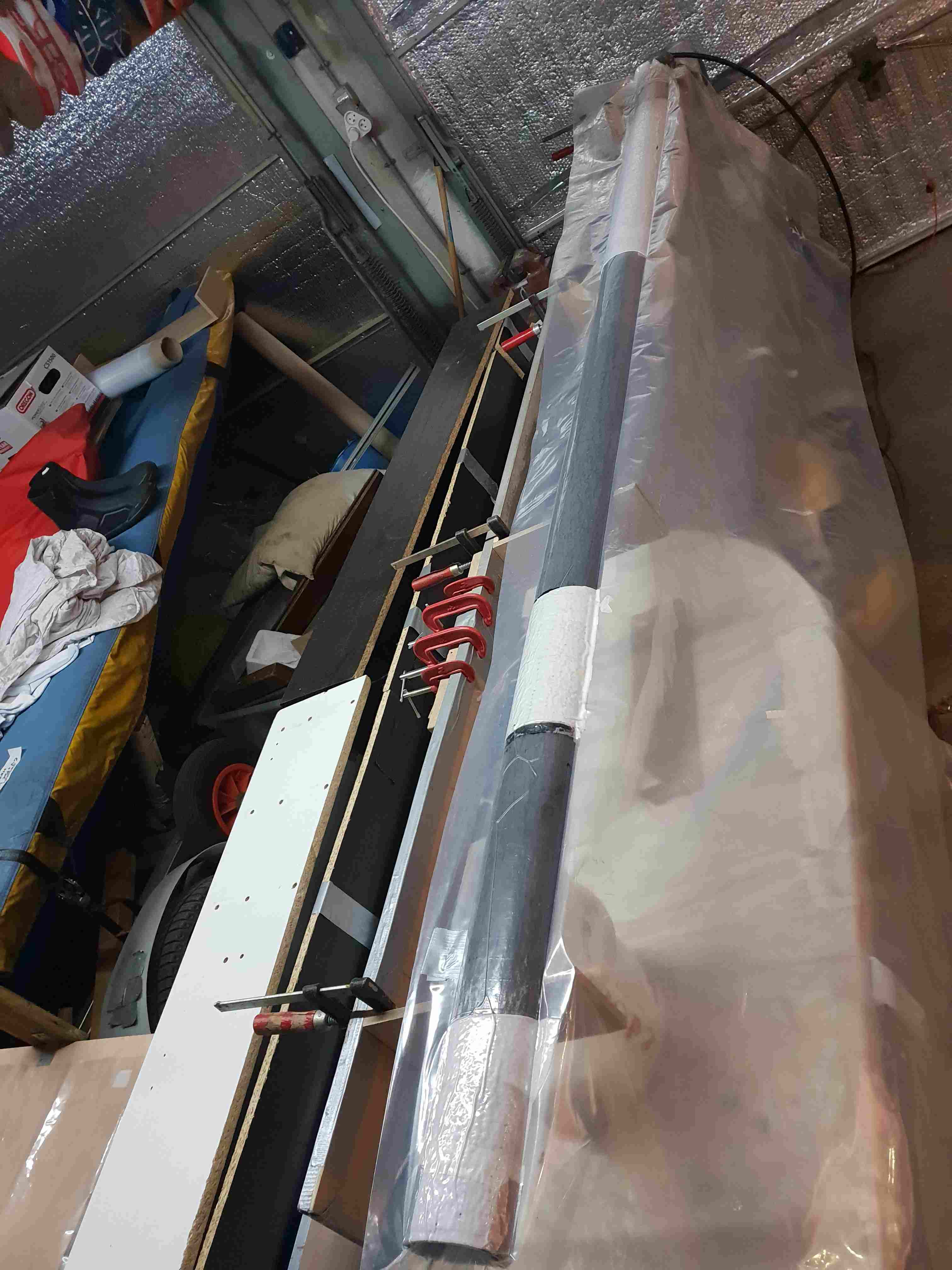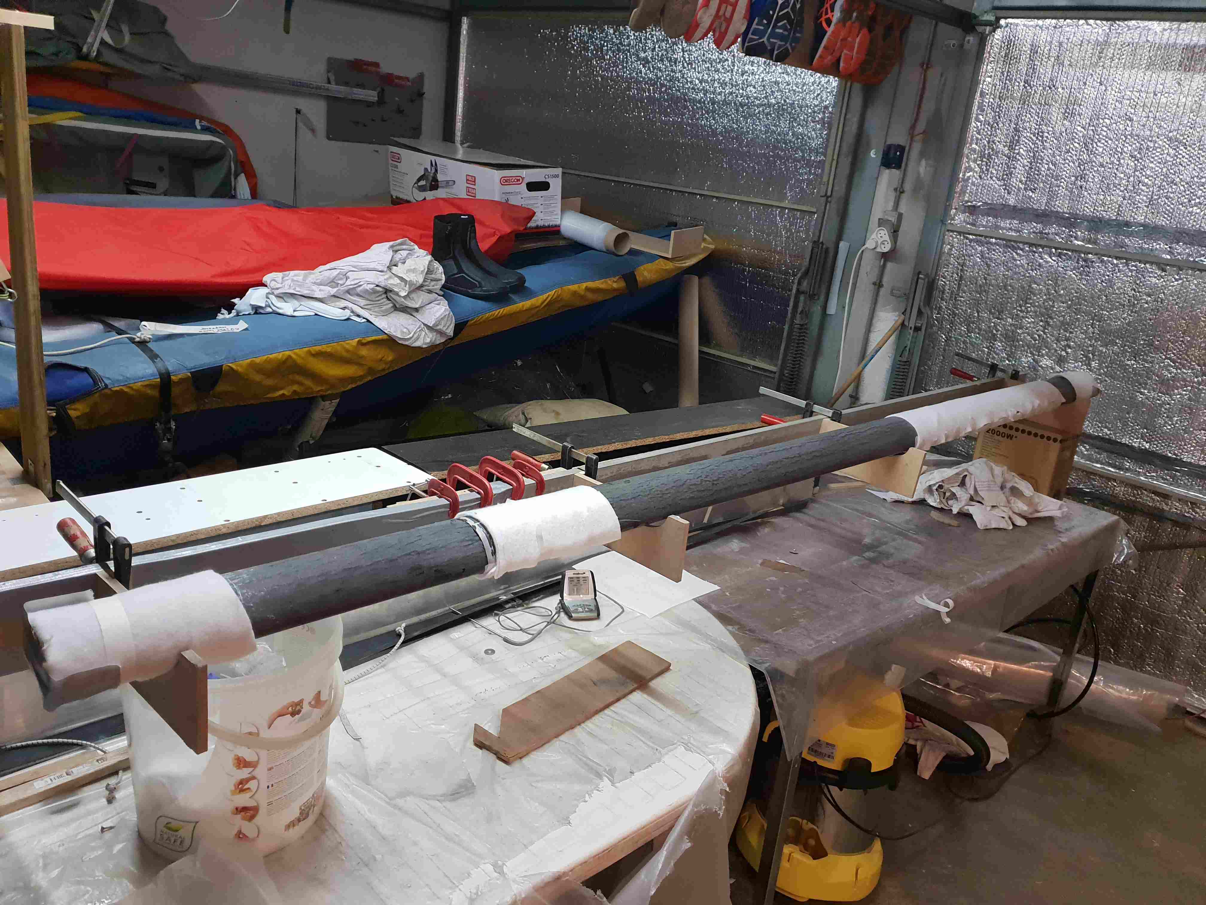 Après de nouveaux renforts extérieurs cette fois-ci sur les 4 zones sensibles (donc UD enroulé à 45°C en spirale sur la zone du hale bas, sur 60 cm environ) :